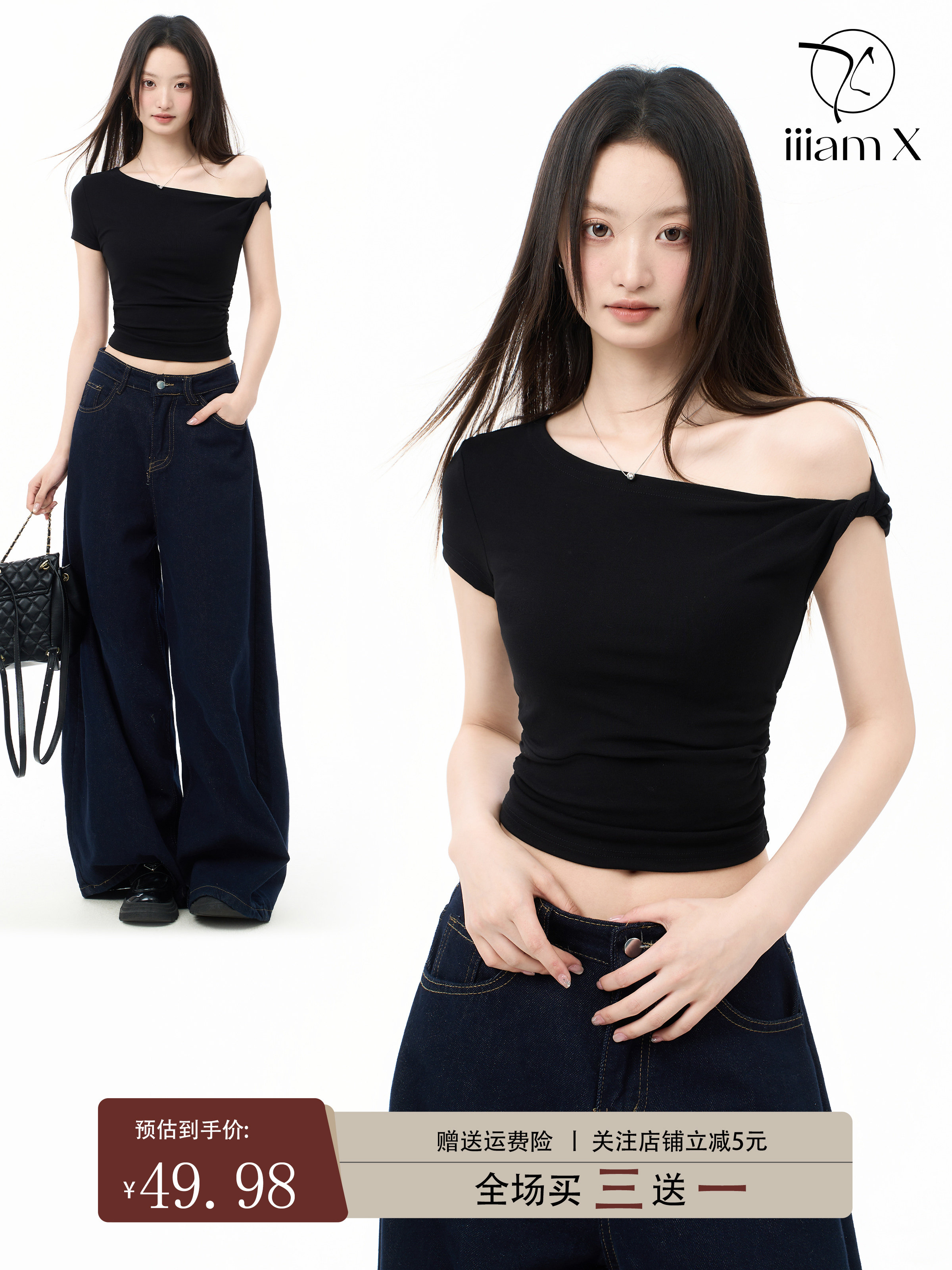 Iiiamx Black Short Off-Shoulder Short-Sleeve T-Shirt for Women, Summer Off-Shoulder Slim-Fit Short-Sleeve Regular Shoulder Top, 2025 New Model