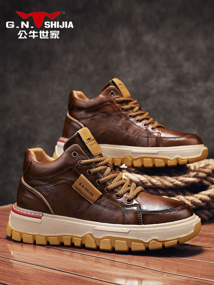 Bull Family High-Top Sneakers for Men, Spring 2026 New Model, High-End Thick-Soled Height-Increasing Men's Shoes, Casual Men's Leather Shoes