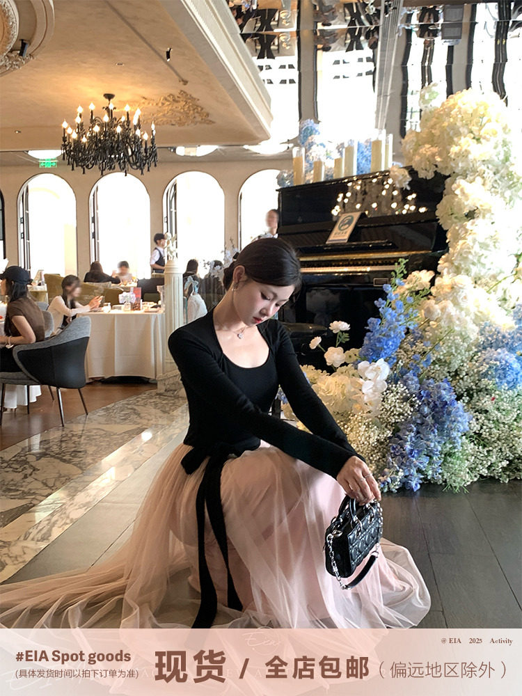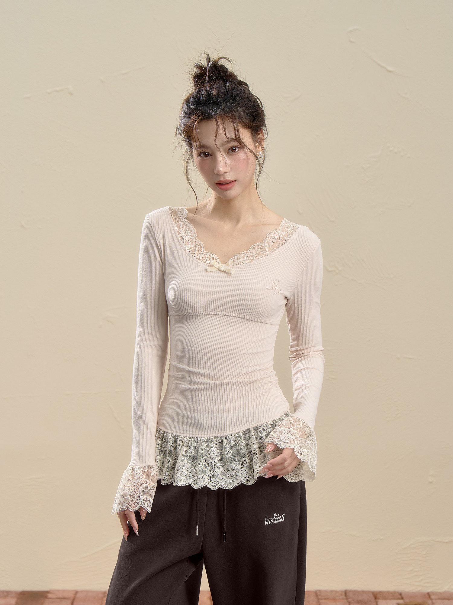Insliisa Korean Style Lace Early Autumn Apricot-Colored Long-Sleeve T-Shirt for Women, Slim Fit, Flattering, Pure and Desirable, Can Be Worn as an Outer Layer or as a Base Layer