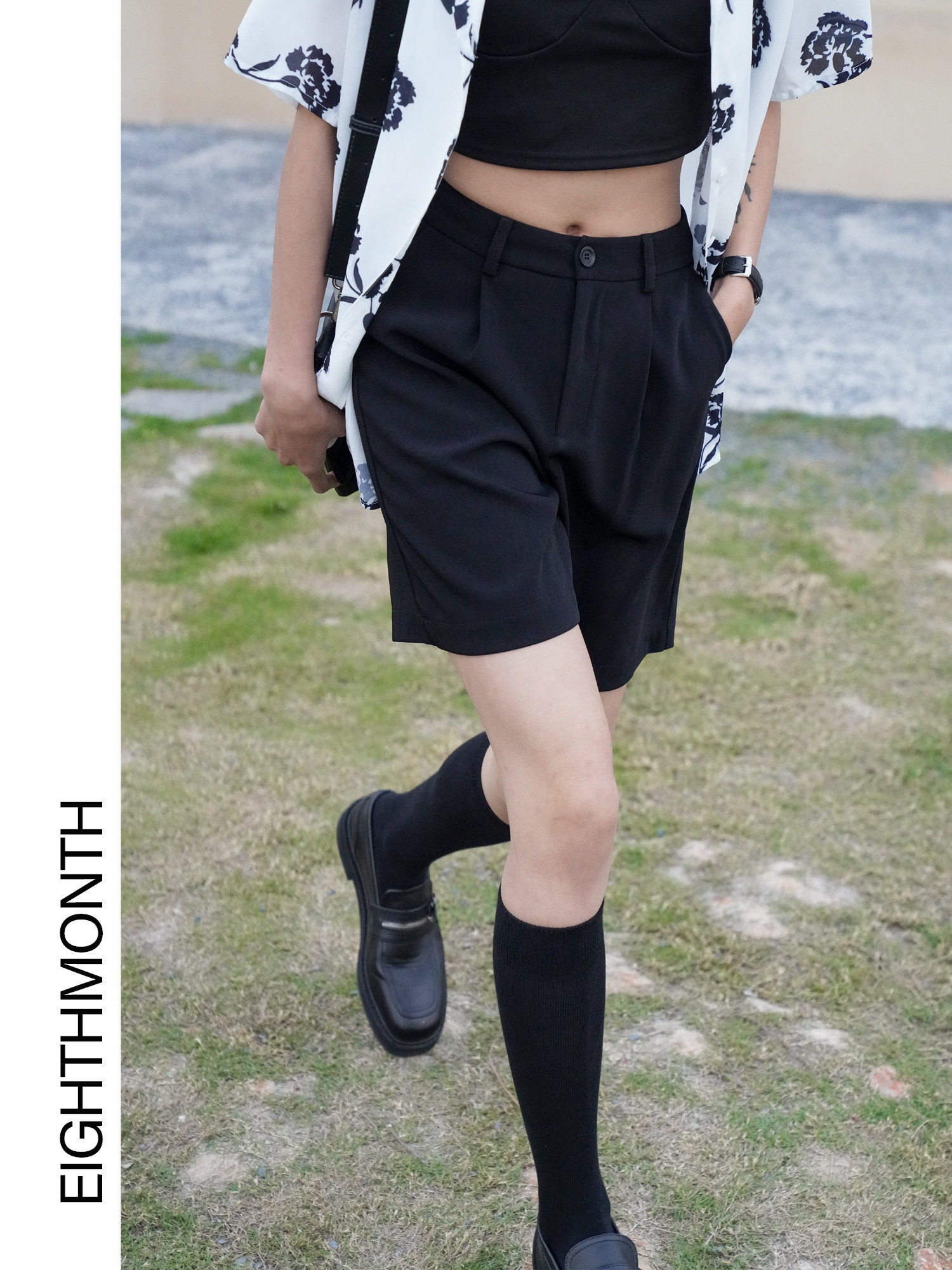 August Suit-Style Straight-Leg Shorts for Women, High-Waisted Wide-Leg Pants, Black Slimming Mid-Length Pants, 2024 Summer New Style Five-Point Pants