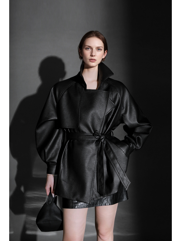 Piaoin High-End Lychee-Patterned Waist-Cinching Leather Jacket for Women with a Suit Collar, Versatile Commuter Short Jacket, New Spring Model