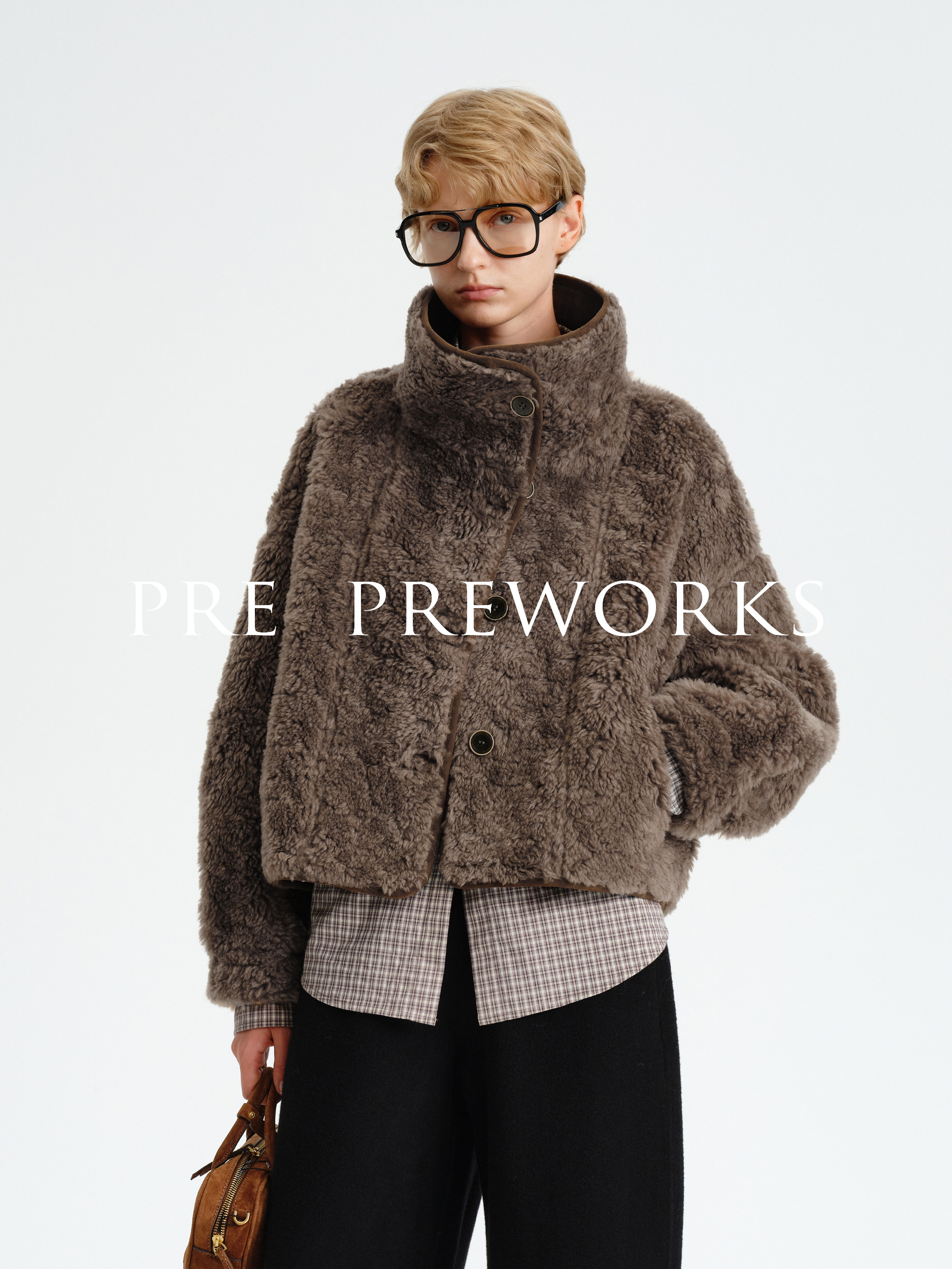 Pre Preworks Retro Sheep Wool Reversible Stand-Up Collar Cotton Jacket, Fur Integrated Suede Woolen Coat