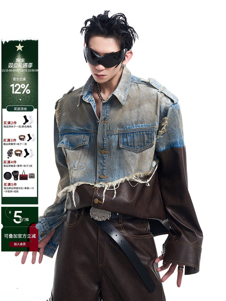 Startexceedend American Retro Distressed Leather Patchwork Denim Jacket for Men, Autumn and Winter Dirty Jacket