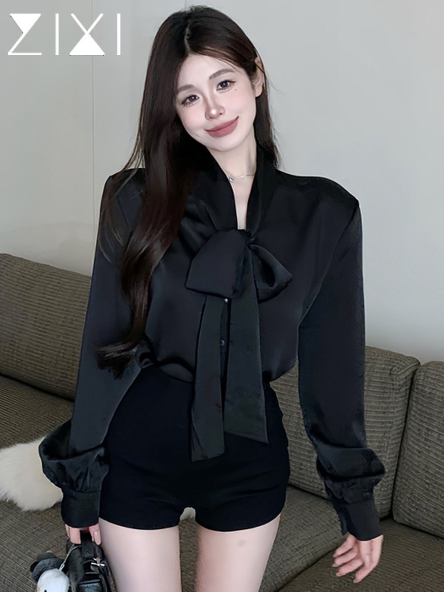 Black Satin Shirt for Women 2025 Autumn French Style High-End Outfit Shirt Workplace Commute Bow Top