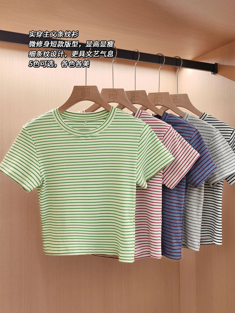 Meiyang【In Stock】Diary T-Shirt Basic Round Neck Striped Slim Fit Slimming Regular Shoulder Short Sleeve
