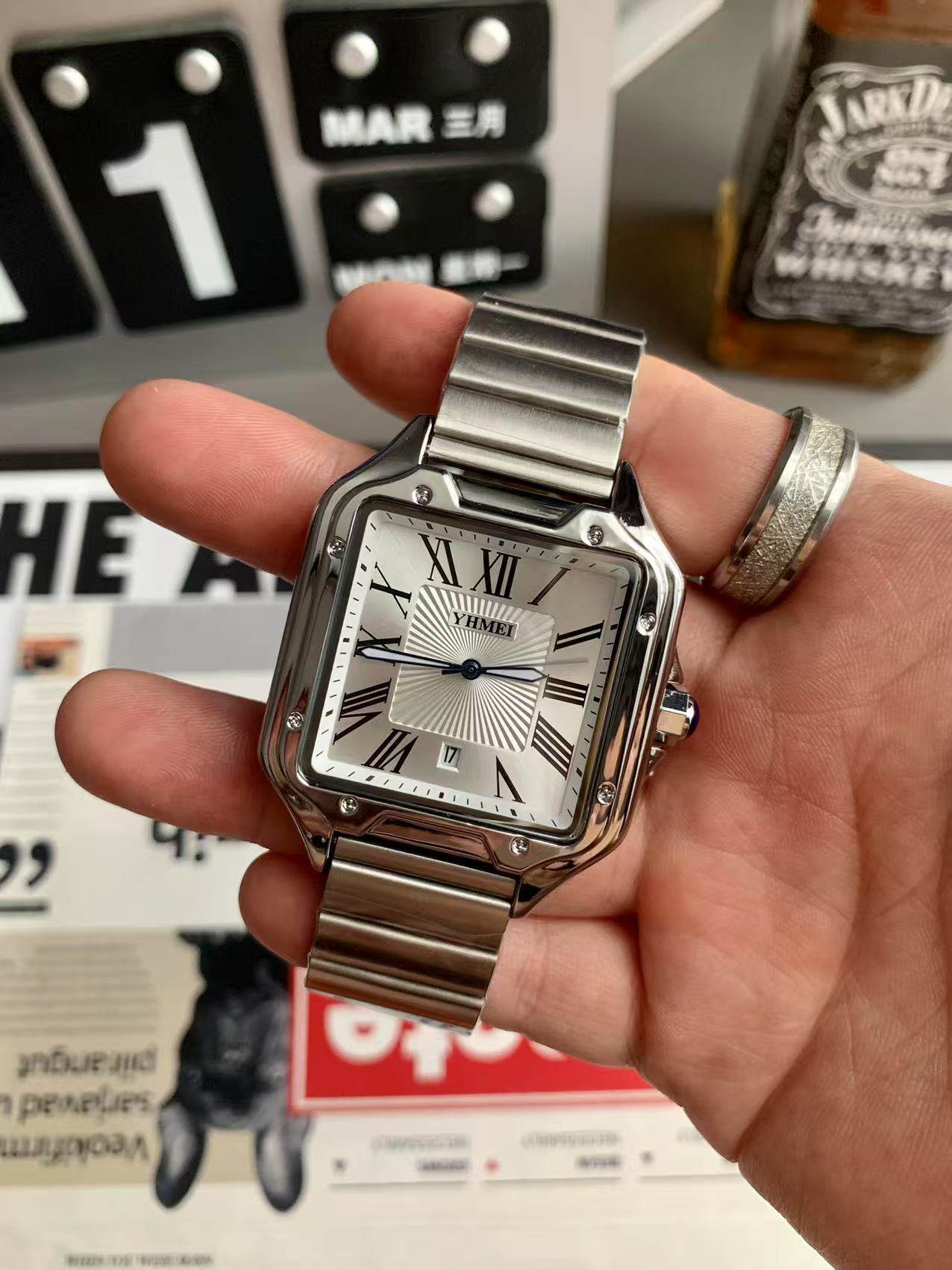 New Square Retro Watch for Men with Roman Numerals, Minimalist Style, ins Bamboo-Patterned Steel Band, Large Dial Quartz Watch for Students