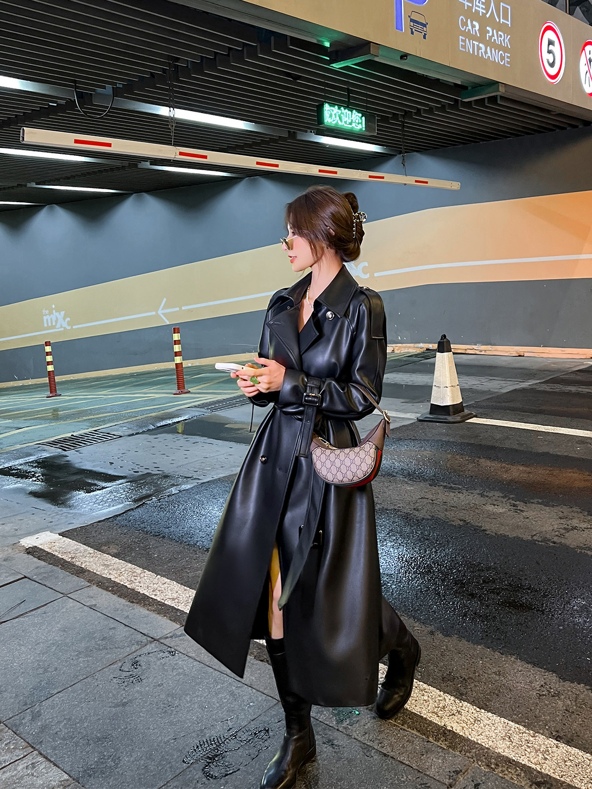 Black Pu Leather Trench Coat for Women, Long Style, 2026 Spring and Autumn New Model, High-End Feel, Loose Fit, Waist-Cinching, Casual and Elegant Coat