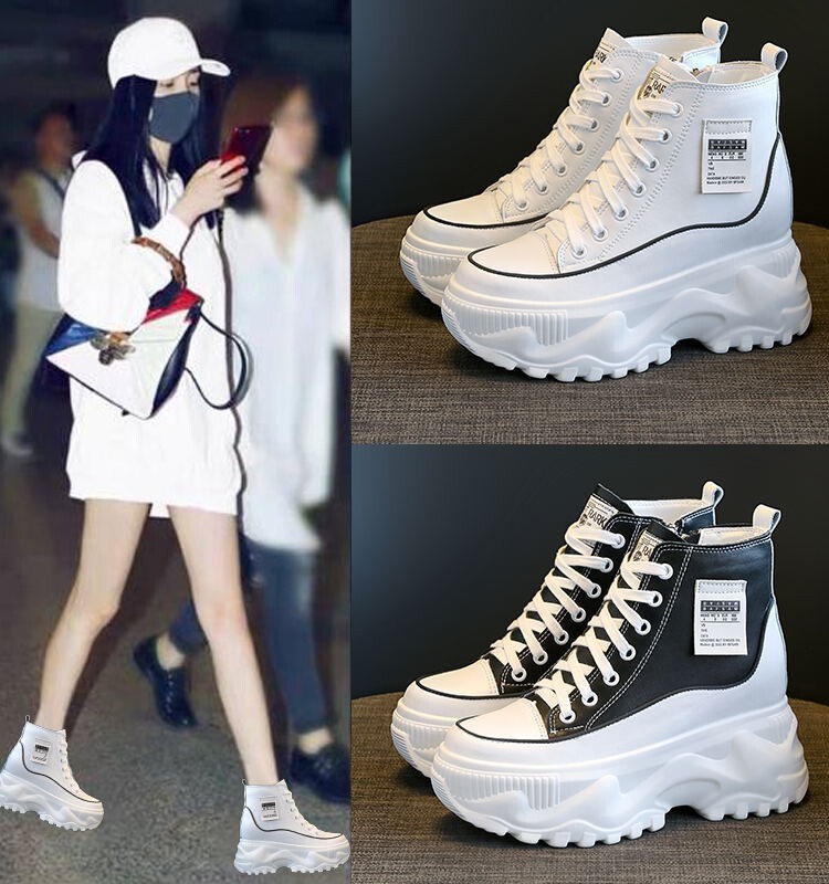 High-Top Shoes with Thick Velvet Lining, 8cm Thick Sole, Genuine Leather White Sneakers for Women, 2025 Autumn and Winter New Style, Height-Increasing Dad Casual Shoes