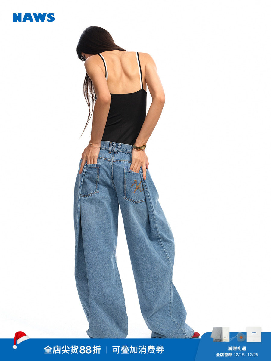 Naws【Same Style as Niyi】Ceramic Denim Baggy Pants Washed Reverse Pocket Wide Leg Jeans Long Pants
