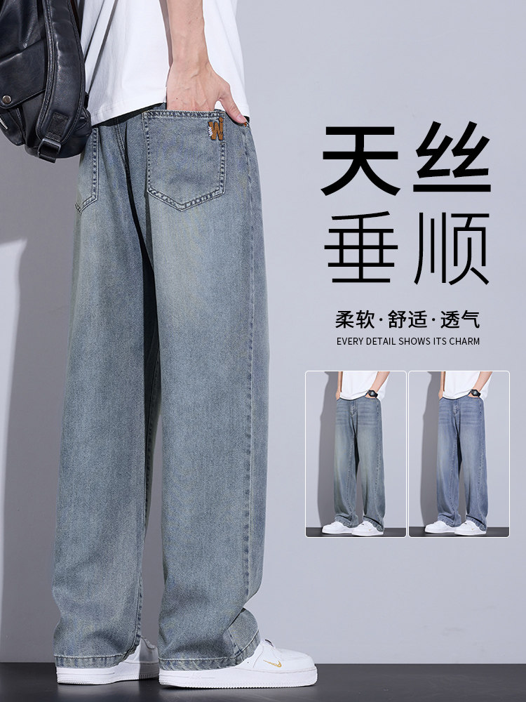 Tencel Jeans for Men 2025 New Summer Thin Vintage Loose Straight Wide-Leg Ice Silk Casual Pants for Men
