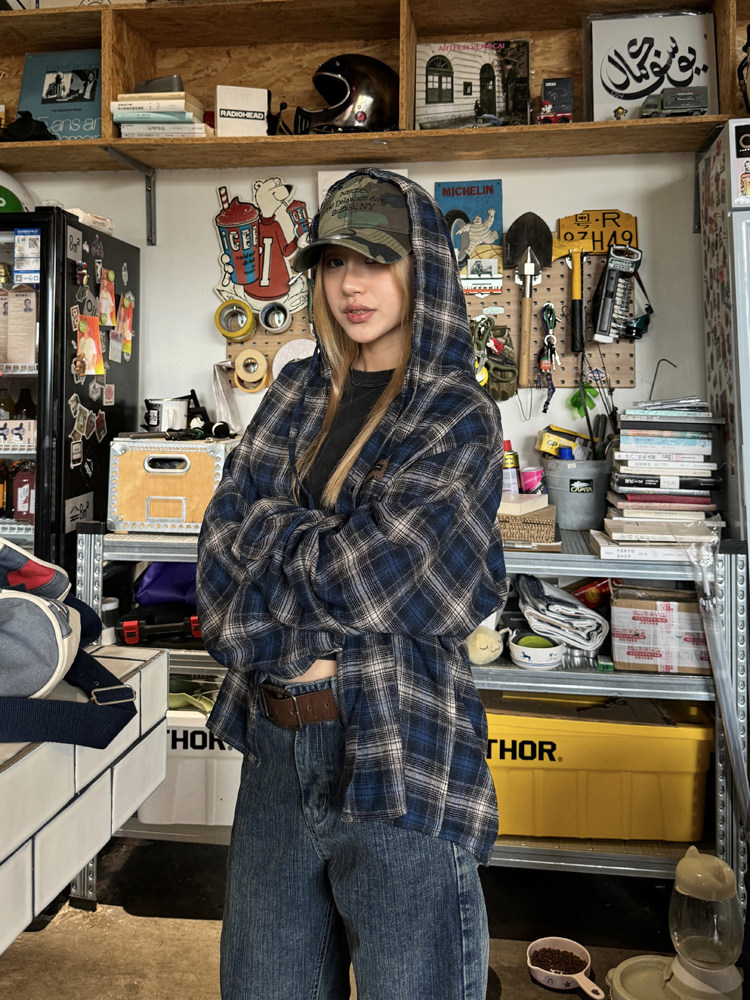Chuanchuan Also Features a Color-Blocked Plaid American-Style Hooded Long-Sleeve Shirt for Men and Women, a Retro Street-Style Loose Casual Polo Shirt from a Trendy Brand