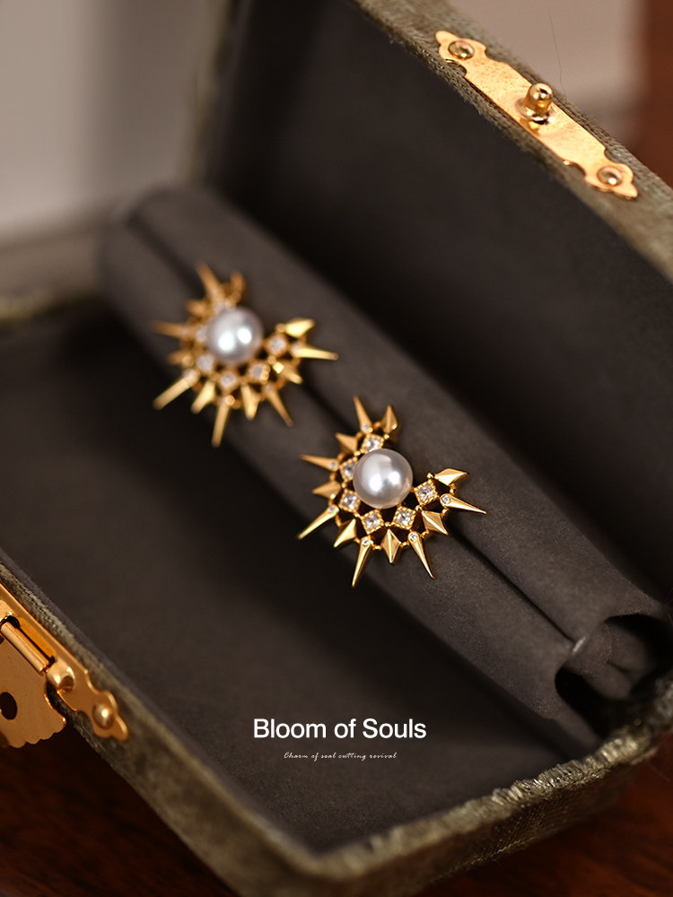 Original Design of the Sunburst Pattern S925 Sterling Silver Natural Freshwater Pearl Earrings, French Retro Style Earrings for Women with a High-End Feel