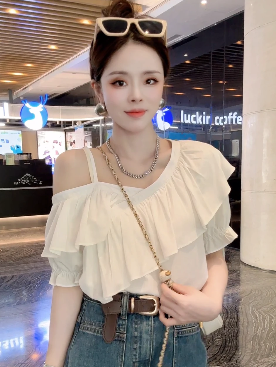 Korean-Style Ruffled Off-The-Shoulder Shirt for Women, Spring and Summer, Sweet and Youthful, Beautiful Blouse, Exposed Shoulder Top