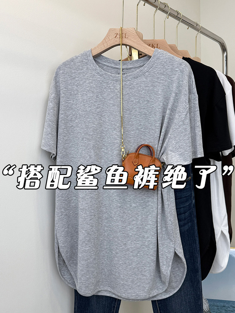 Lanjing Modal Stretchy Oversized T-Shirt Paired with Shark Pants, Short-Sleeved Women's Summer Top with Arc Side Slit, Loose Fit