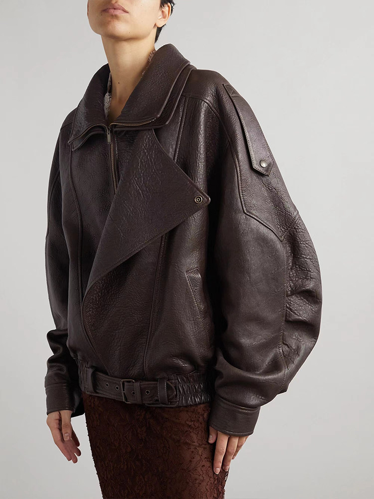 Yangshulin Autumn and Winter Collection Imported Embossed Leather Jacket for Women, Double Collar Short Biker Style Loose Coat