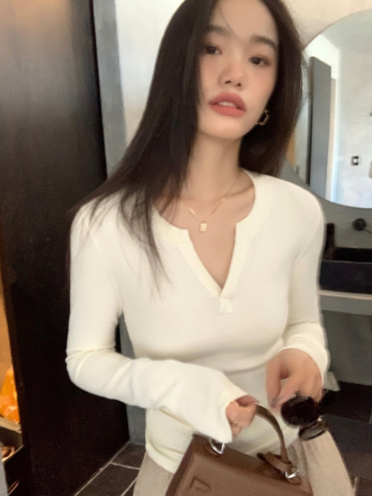 Pusumede Weekend Date Black V-Neck Long Sleeve T-Shirt Women's Inner Layer Knitted Slim Fit Top