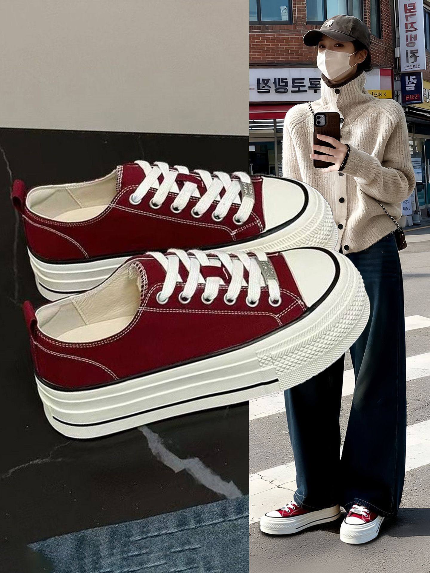 Hong Kong Thick-Soled Round-Toe Canvas Shoes for Women 2025 Spring and Autumn New Style Height-Increasing Lace-Up Casual Versatile Sneakers
