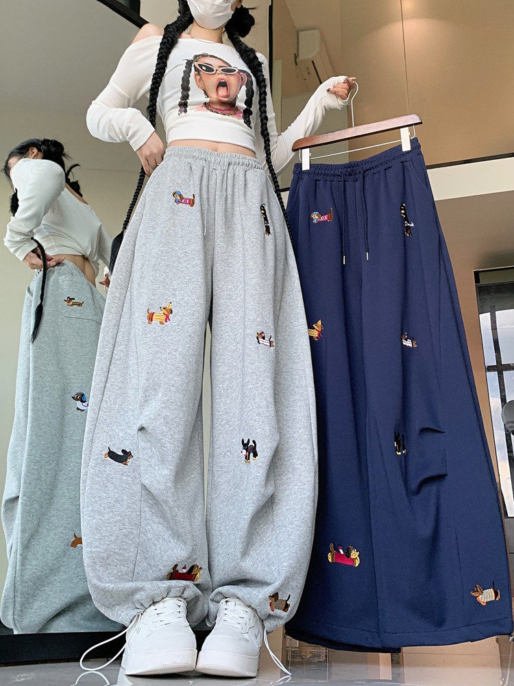 American Retro Cartoon Embroidered Scimitar Sweatpants for Women, Spring and Autumn Loose Straight Wide-Leg Pants, Versatile Sports Casual Long Pants