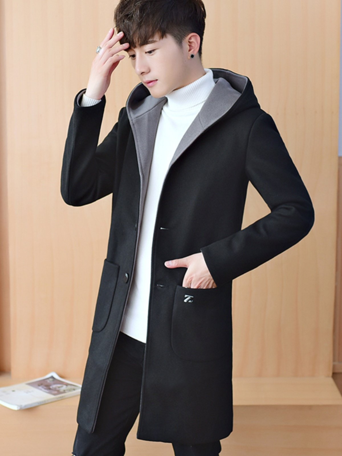 Woodpecker Spring and Autumn Men's Mid-Length Woolen Coat Windbreaker Hooded Reversible Winter Double-Sided Woolen Coat