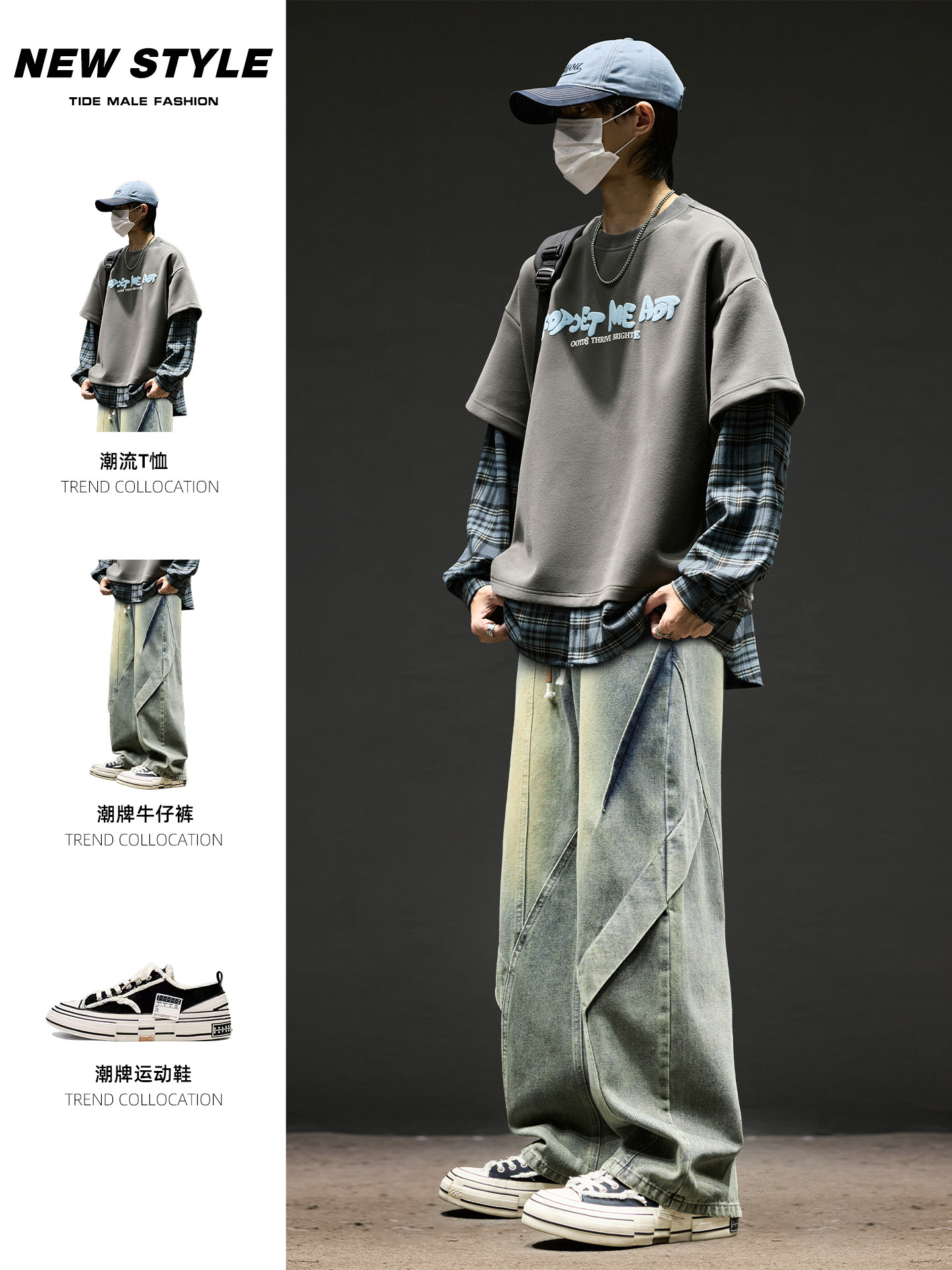 Men's Suit with a Fake Two-Piece T-Shirt Paired with Vintage Jeans, a Cool and Stylish Outfit for Men, a Trendy Autumn and Winter Men's Clothing Set