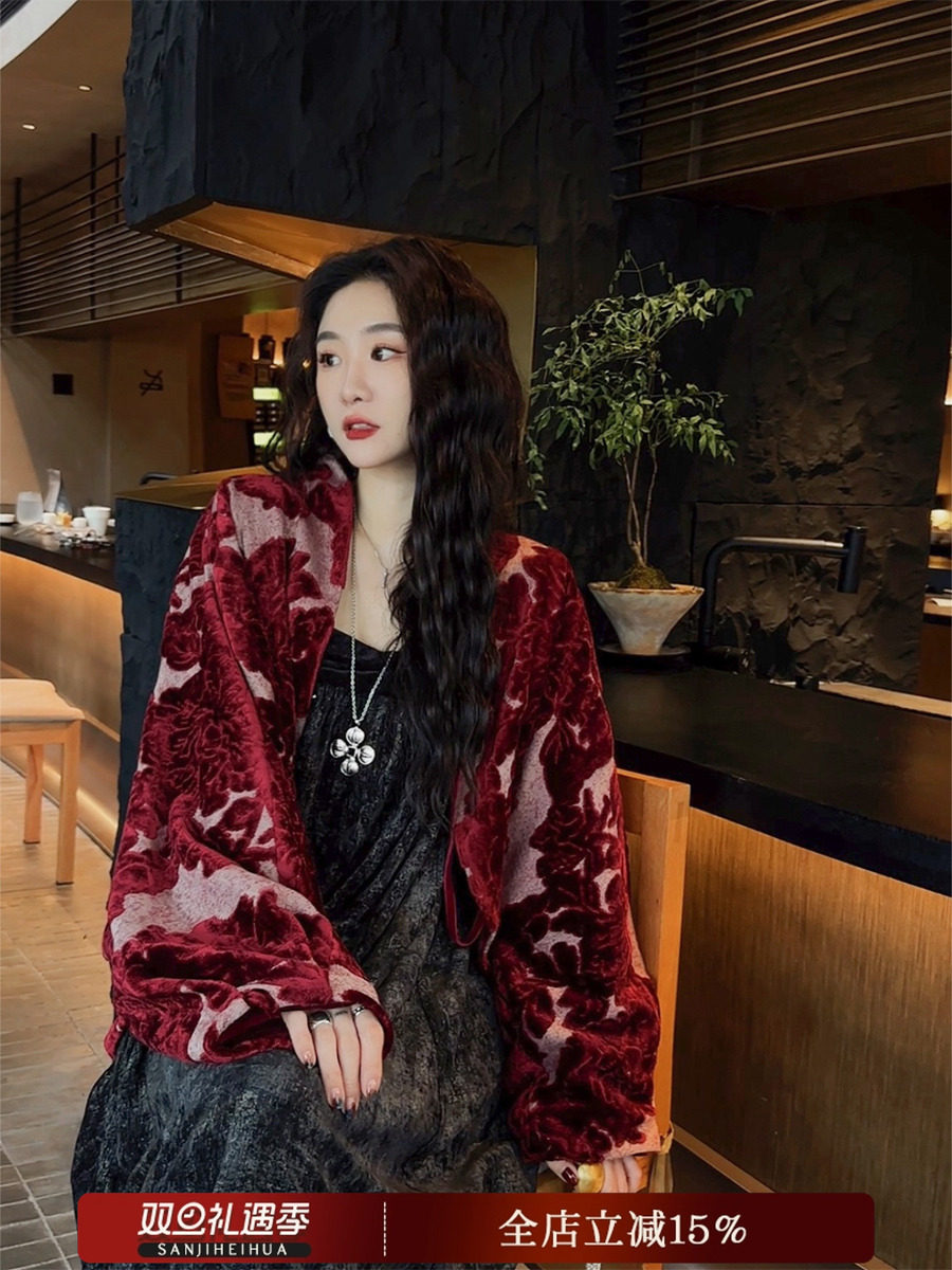 Sanji Black Flower [Magnolia] New Chinese Style Shearling Jacket for Women, Autumn/Winter 2024 New Popular Style, This Year's Trendy Shearling