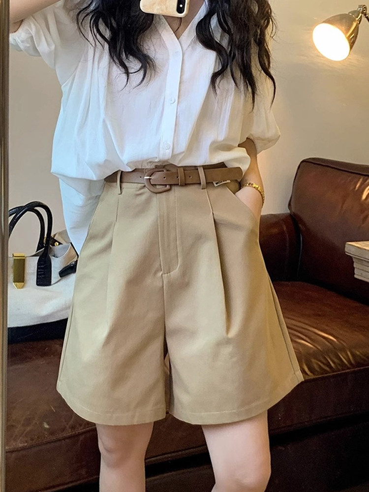 Khaki High-Waisted Casual Shorts for Women, Summer Plus Size, Versatile, Slimming, Straight-Leg A-Line, Mid-Length Wide-Leg Shorts