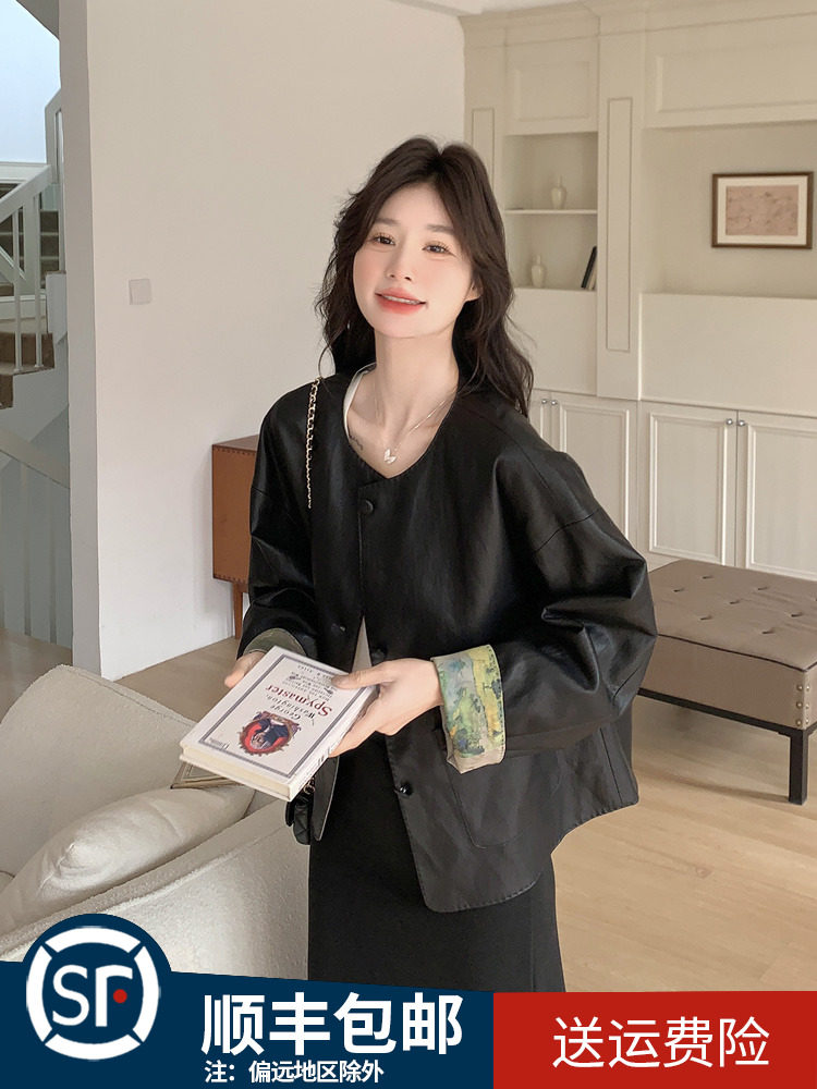 Black New Chinese-Style Leather Jacket for Women, 2025 Spring and Autumn New Model, Petite, Elegant, Fashionable, Reversible Jacket