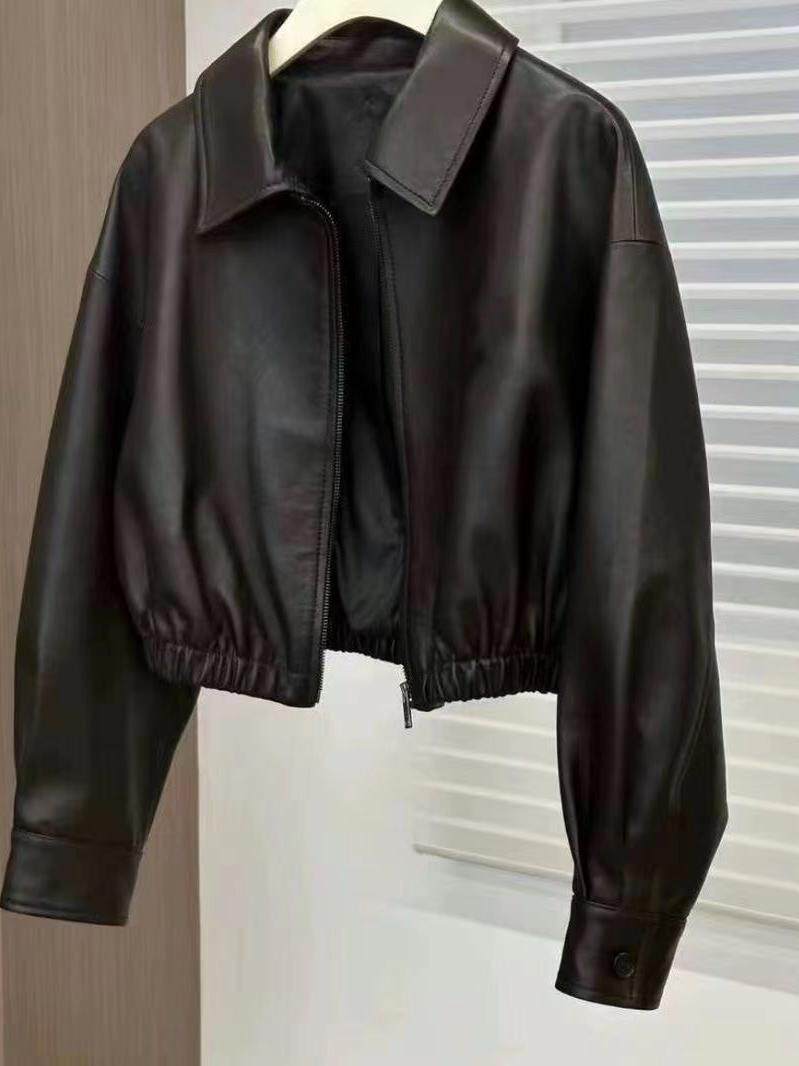 Black Versatile Leather Jacket for Women, High-End Turn-Down Collar, Square Collar, Unique Design, Stylish Elastic Waist Leather Jacket, Biker Jacket