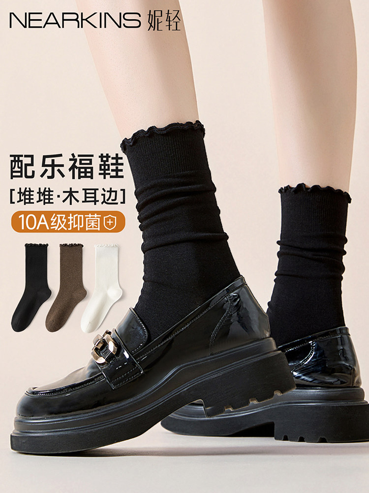 Black Pure Cotton Mid-Calf Socks with Ruffled Edges for Women, Suitable for Autumn and Winter, to Pair with Loafers or Casual Shoes, Maternity Long Socks