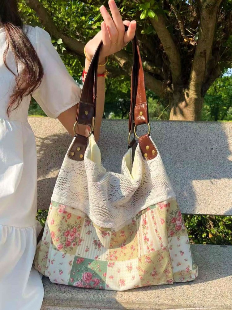 Forest-Style Vintage Lace Floral Plaid Patchwork Fabric Bag 2025 New Casual Versatile Shoulder Tote Commuter Bag