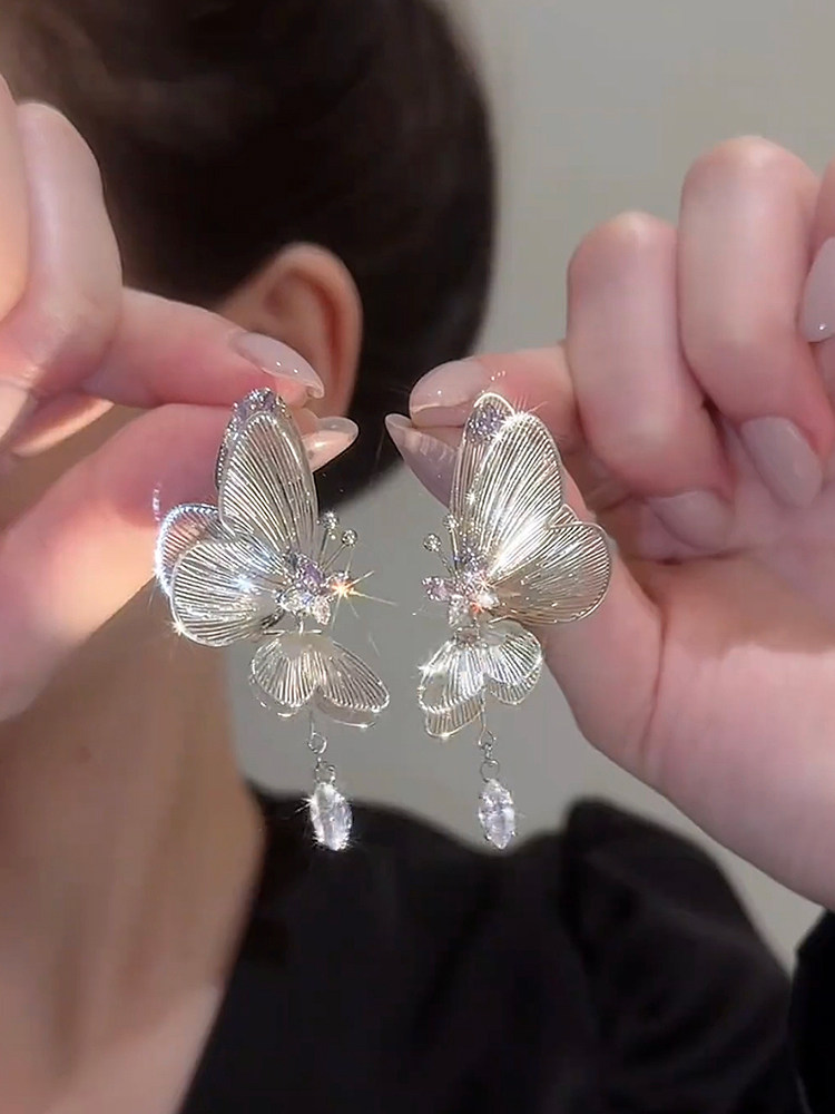 Hollow Three-Dimensional Silver Butterfly Pendant Earrings, Elegant and Unique Design, Long Tassel Earrings, Silver Needle Studs for Women