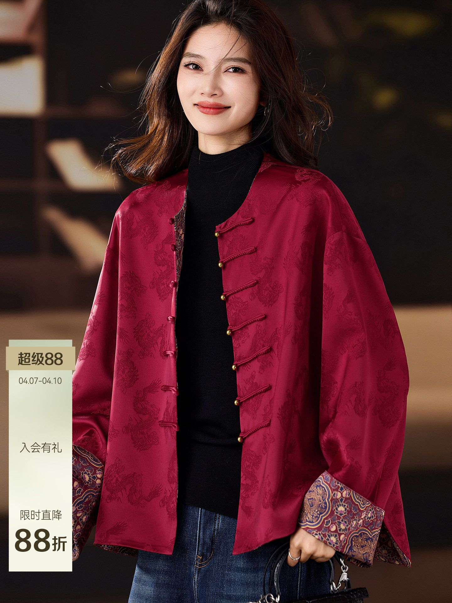 Vintage New Year Red Jacquard Patchwork Jacket for Women, Spring 2026 New Chinese Style Top, Plus Size Women's Clothing