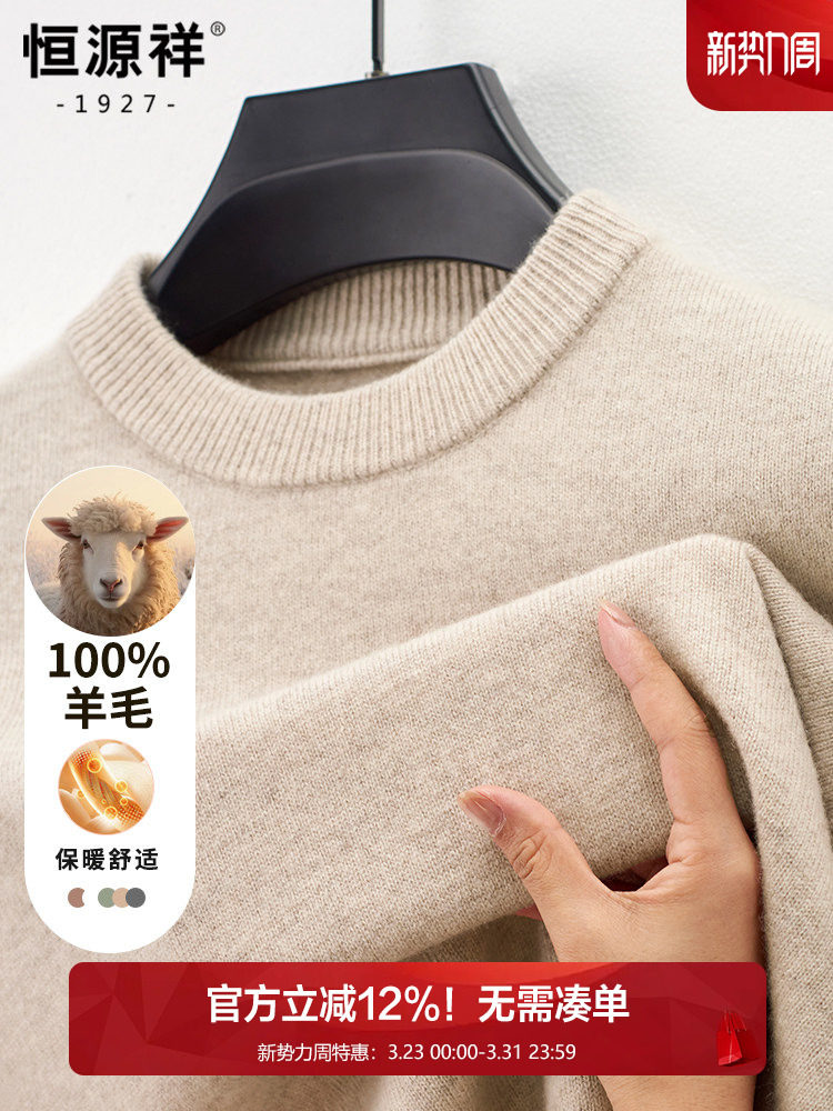 Hengyuanxiang Round Neck 100% Wool Sweater for Men, Warm Inner Layer Sweater for Middle-Aged Dads, Solid Color Casual Base Shirt