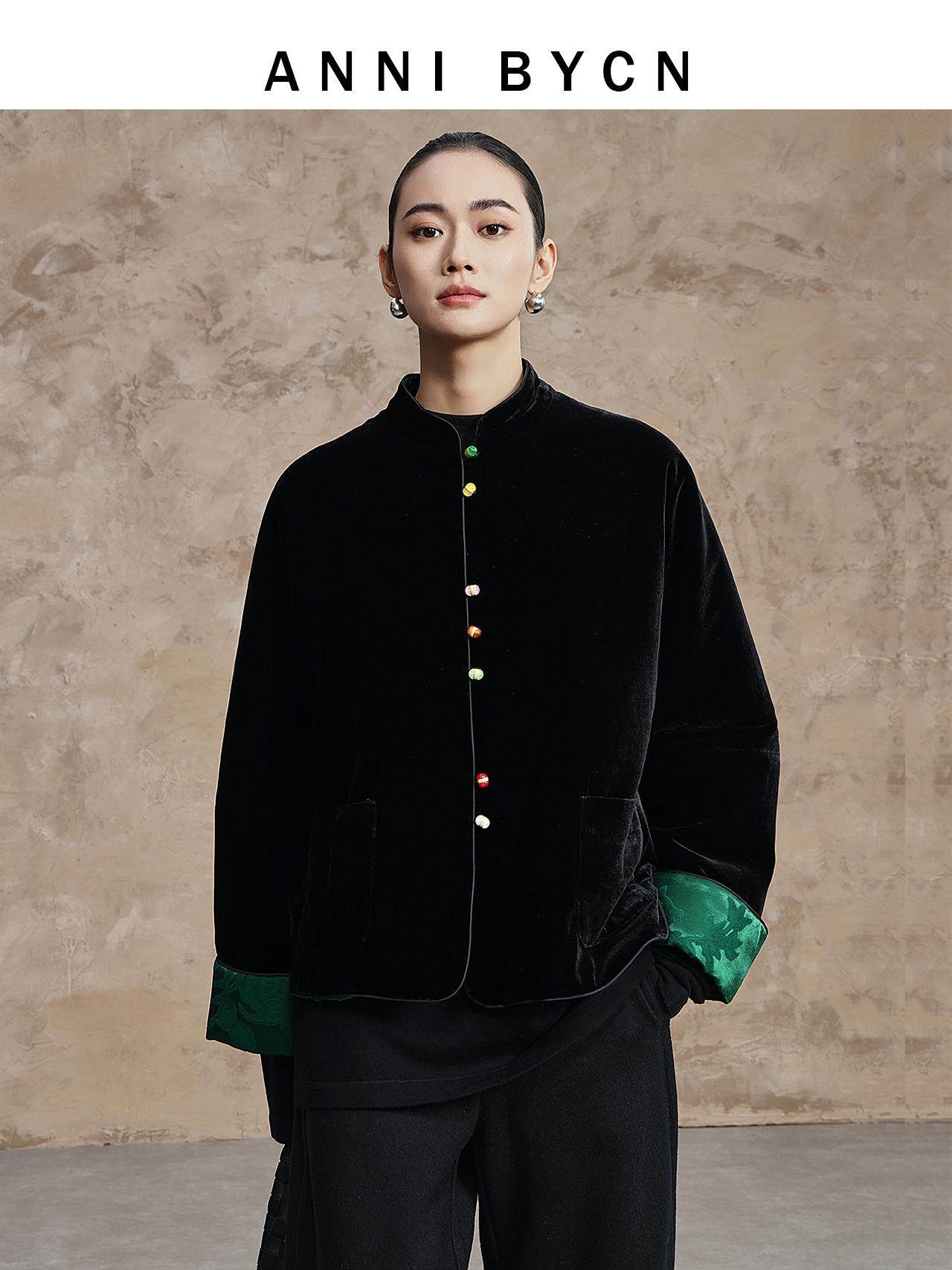 Annibycn Reversible Silk Velvet Quilted Cotton Jacket for Women, Autumn and Winter New Chinese Style National Style Stand Collar Cotton Coat
