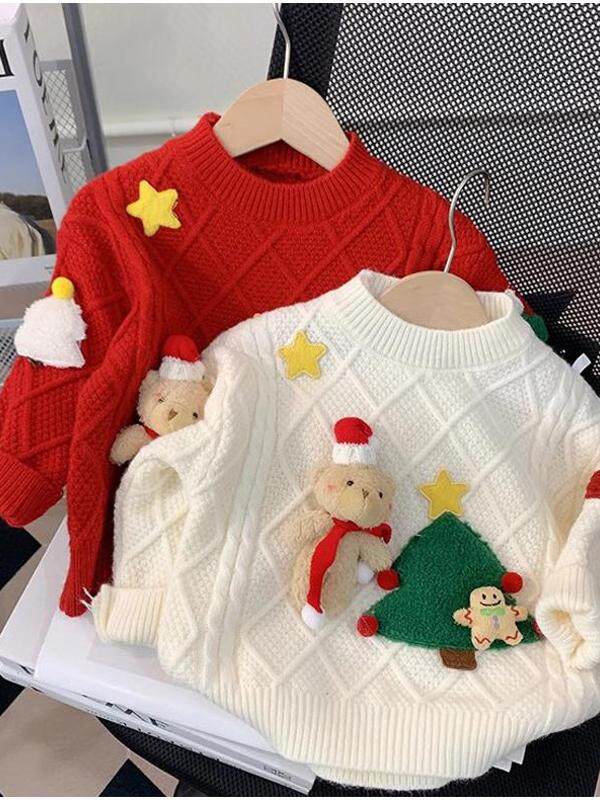 Christmas Outfit Red Cute Sweater for Girls 2025 Winter New White Knitted Sweater for Boys Warm Top