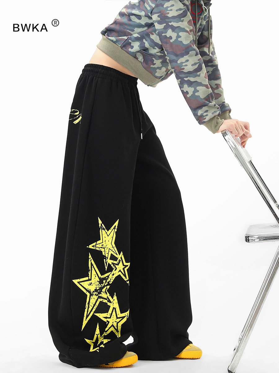 American-Style Star Print Fleece Sweatpants for Women and Men, Autumn and Winter Jazz Dance Sports Pants, Loose and Versatile Wide-Leg Pants