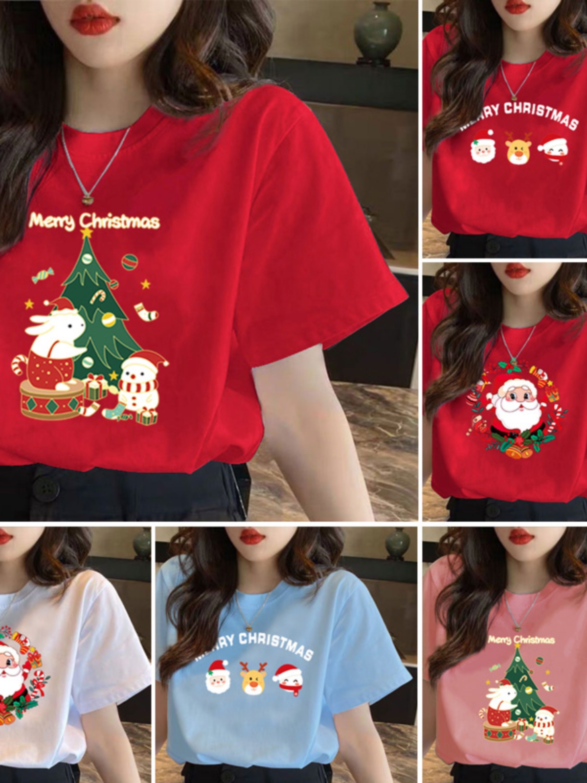Christmas Clothes Red Top Women's Short-Sleeved T-Shirt Loose Reindeer 2026 New Long-Sleeved Merry Christmas