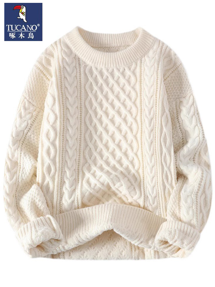 Woodpecker Brand Crew Neck Knitted Cable Sweater for Men, Autumn and Winter Loose Fit Couple's Base Shirt, Trendy Fleece-Lined Thick Long Sleeve
