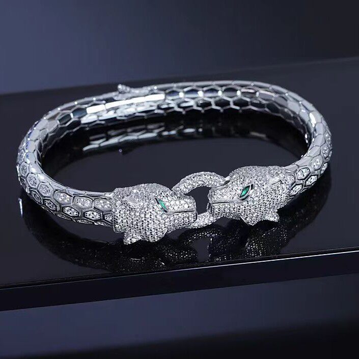 Papas Turkish Niche Luxury High-End Double-Headed Cheetah Bracelet for Men and Women, Full Diamond Leopard Head Imitation Silver Bangle