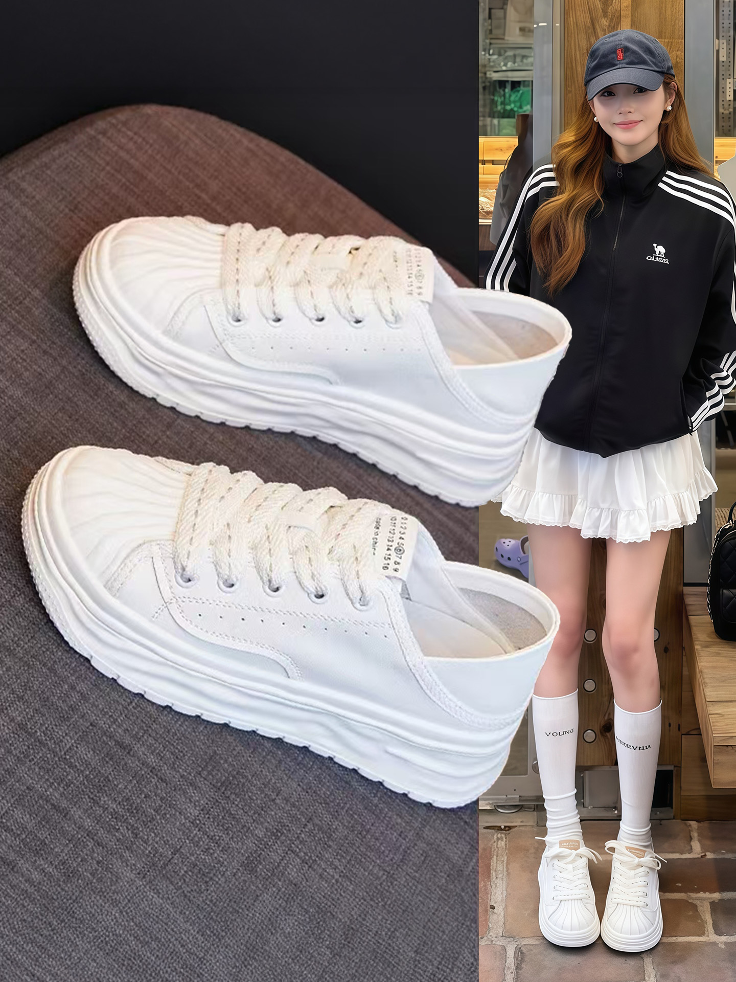 Hong Kong Genuine Leather Shell Toe Sports Casual Shoes for Women 2025 Autumn New Thick-Soled White Shoes Fashionable Lace-Up Sneakers