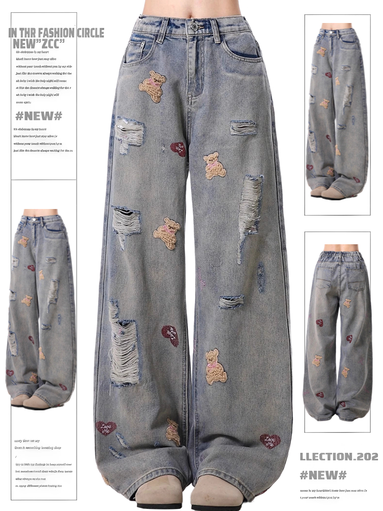 Super Popular Ripped Jeans for Women, New Spring/Autumn 2025 American High Street Style, Washed with Bear Embroidery Design, Wide-Leg Pants