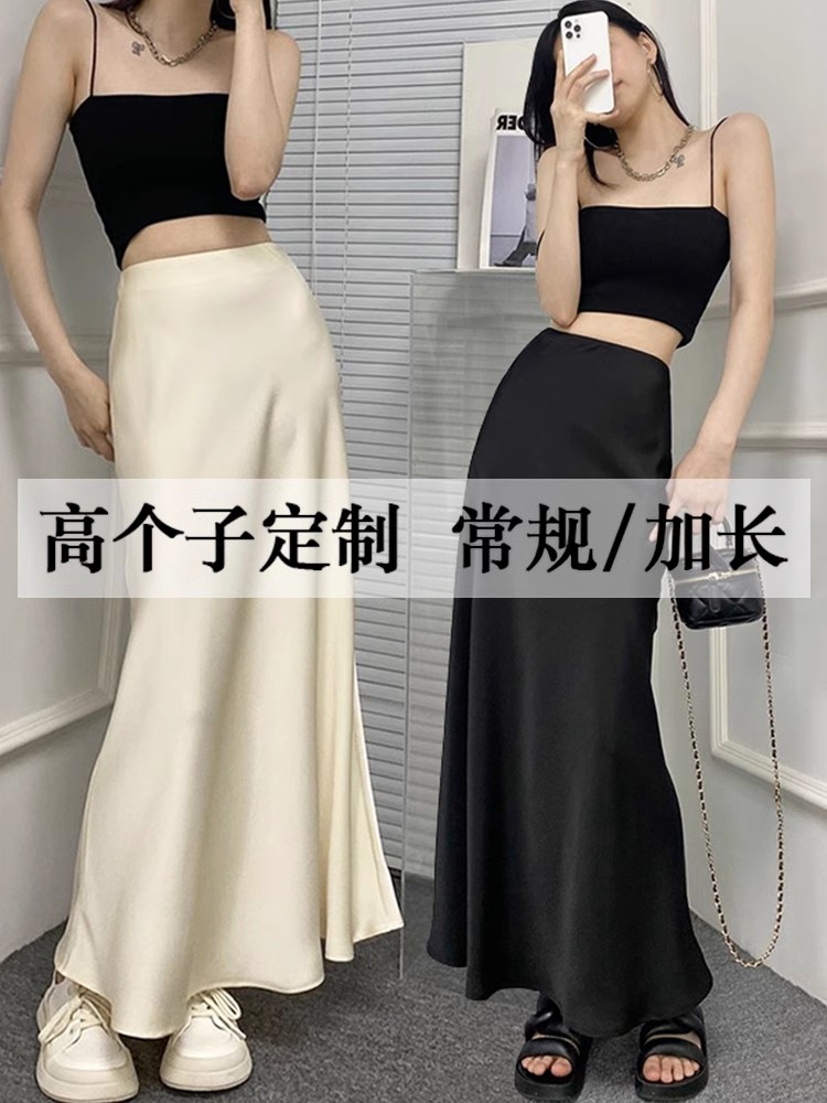 High-End Acetate Satin Fishtail Skirt, Mid-Length Skirt for Tall Women in Summer, Ruffled A-Line Hip-Hugging Skirt