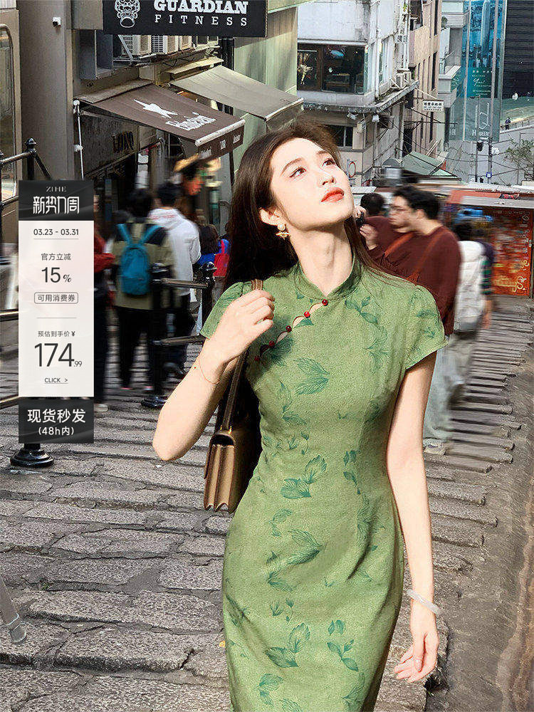 Lingqian Zihedan Green New Chinese-Style Floral Improved Cheongsam Women's Spring and Summer Work Dress Waist-Cinching Slimming Dress