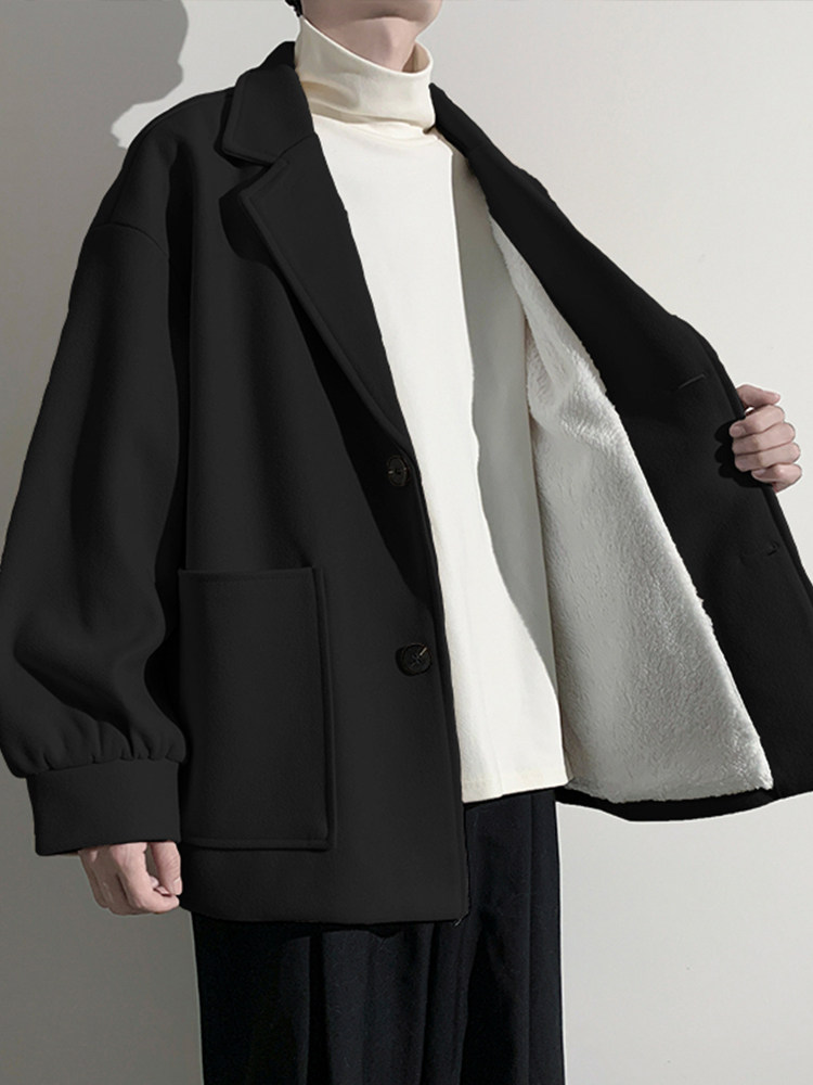 Black Woolen Coat for Men, Short Style, Lamb Wool, Fleece-Lined, Thickened, Winter Warm, High-End Korean Style Trench Coat