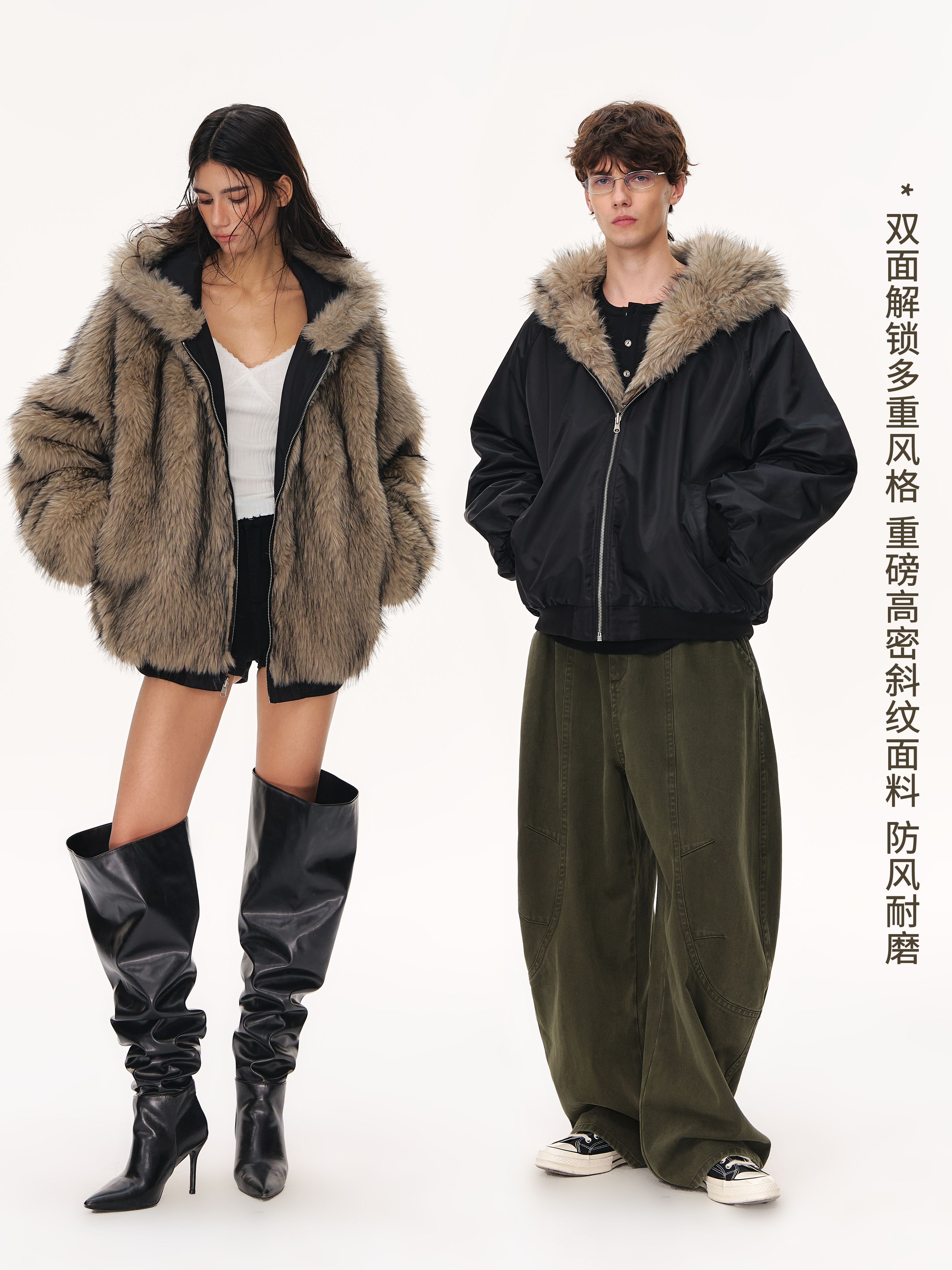 Climax Vision Cold-Proof Magic: Reversible Eco-Friendly Fur Mountain Carving Hooded Parka Jacket