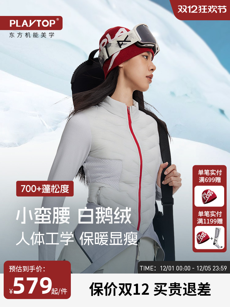 Playtop Goose down Ski Liner Women's Slim Fit Warm Mountaineering Lightweight Ribbed Waist down Jacket Midlayer