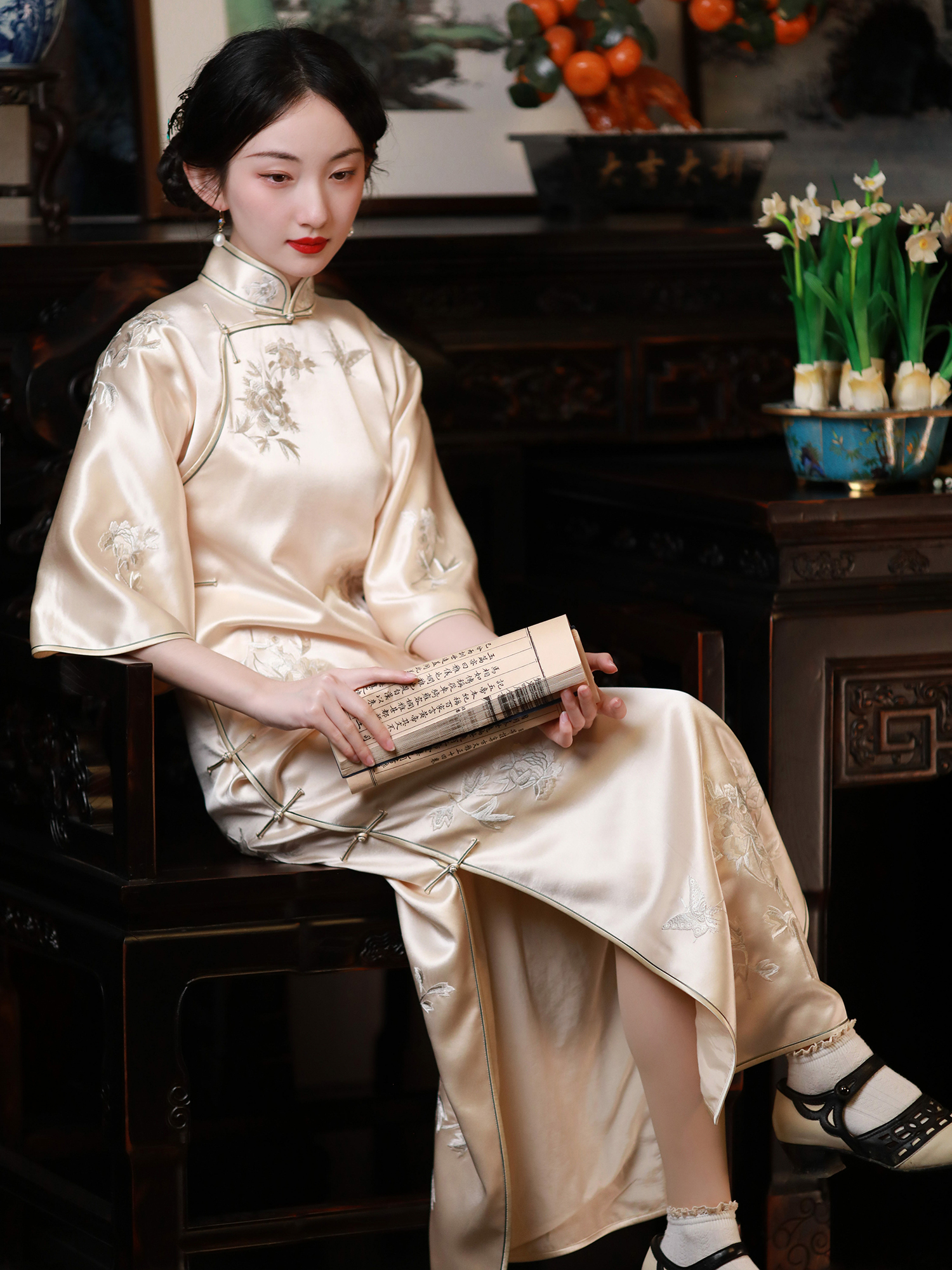 Hairpin Flower Morning Dream | a City of Wind and Snow | Embroidered Stand Collar Retro Republic of China Style Full Sleeve Open Front Cheongsam for Women
