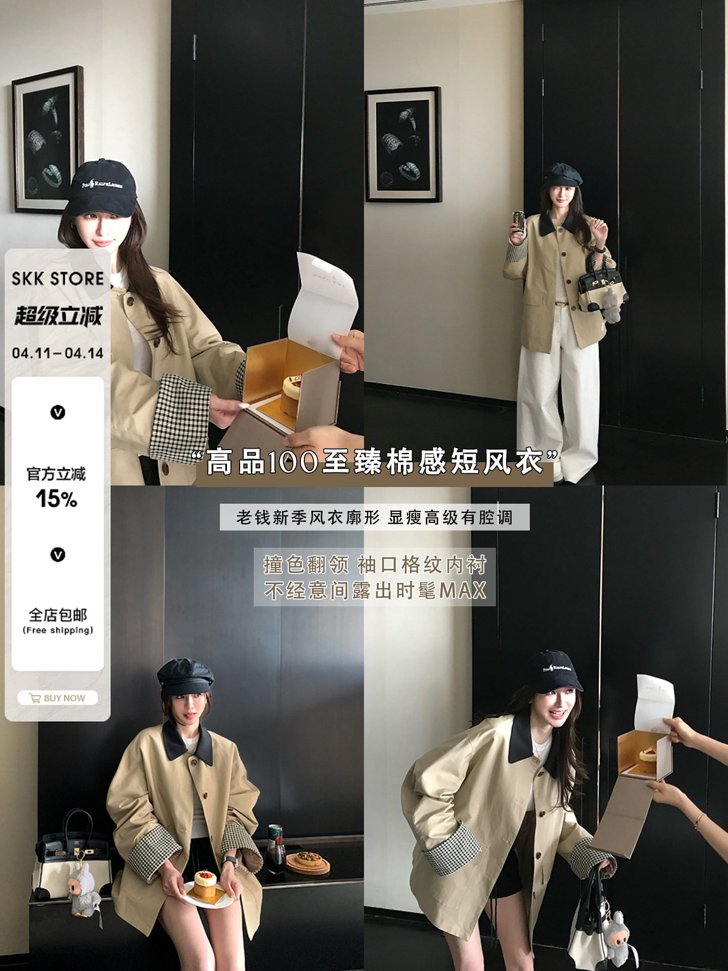 Skk Store Gao Zhiban Style Khaki Trench Coat with Contrasting Plaid Patchwork Short Loose Jacket for Women