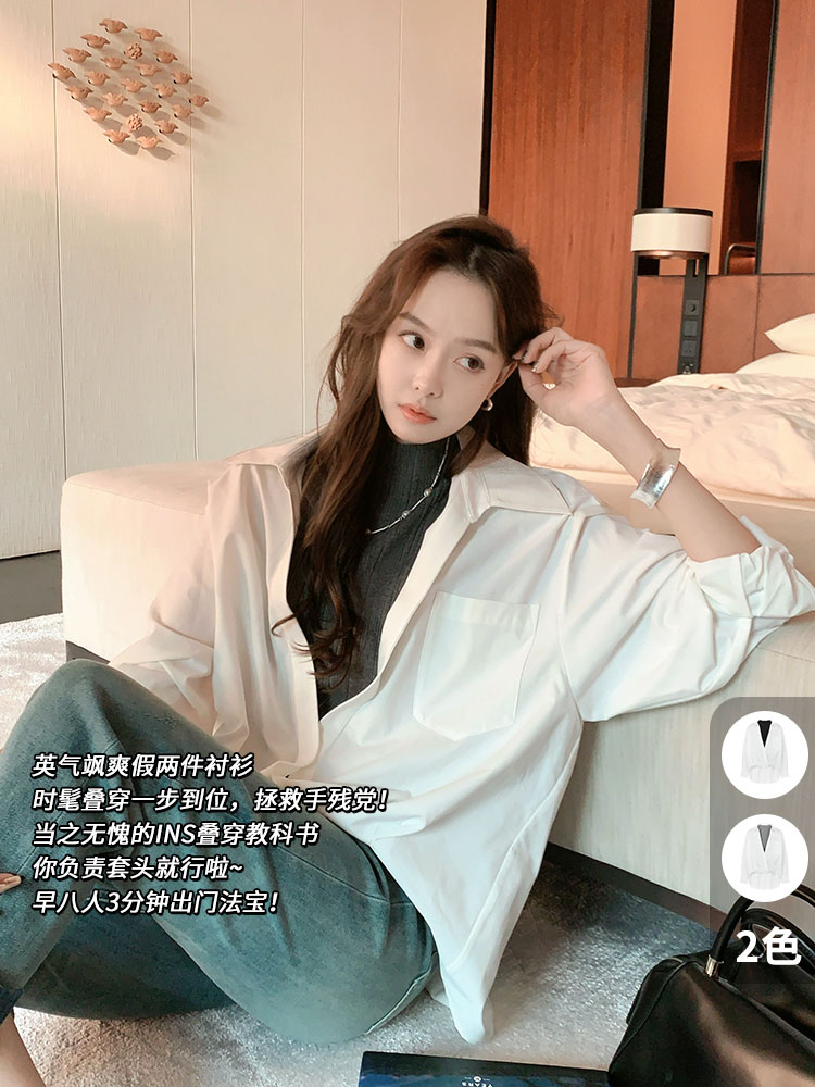 Meiyang【In Stock】Big V Shirt, Short in the Front, Long in the Back, Fake Two-Piece, No-Iron Shirt/Half Turtleneck Vest