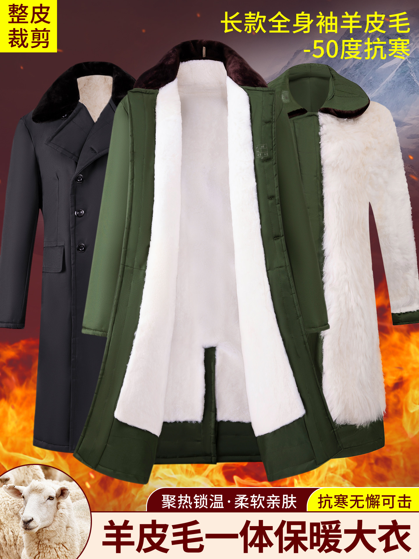 Sheepskin Military Cotton Coat for Men, Integrated Leather and Fur, Long Winter Style, Cold-Proof, Northeast Workwear, Thickened, Warm Wool Cotton Jacket